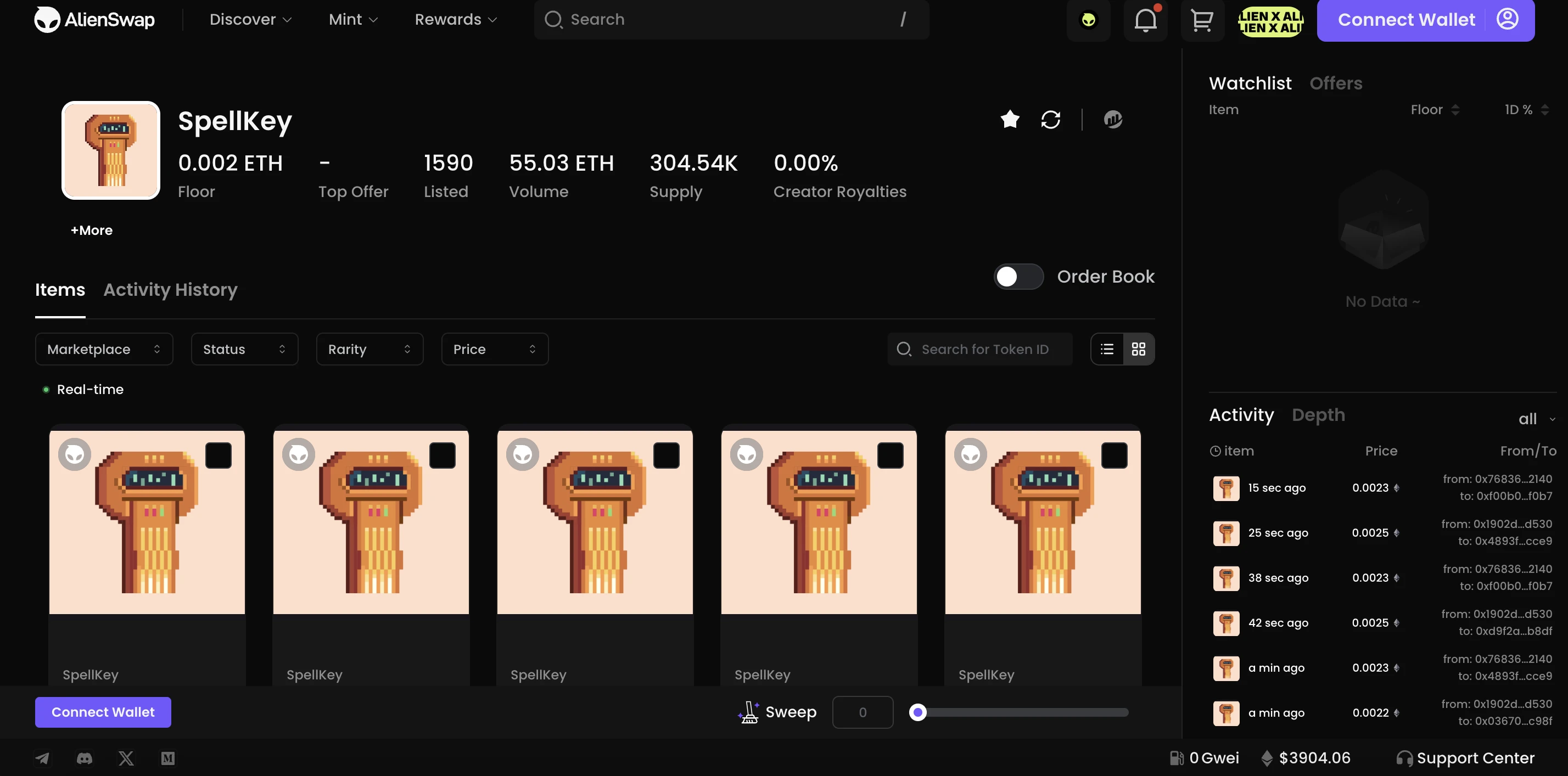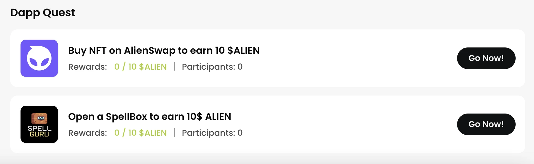 目前测试网刚上线生态项目较少,主要包括 AlienSwap NFT 交易市场、SpellGuru 去中心化 AI 模型训练及数据网络,以及即将上线的 DeTrade DEX。
