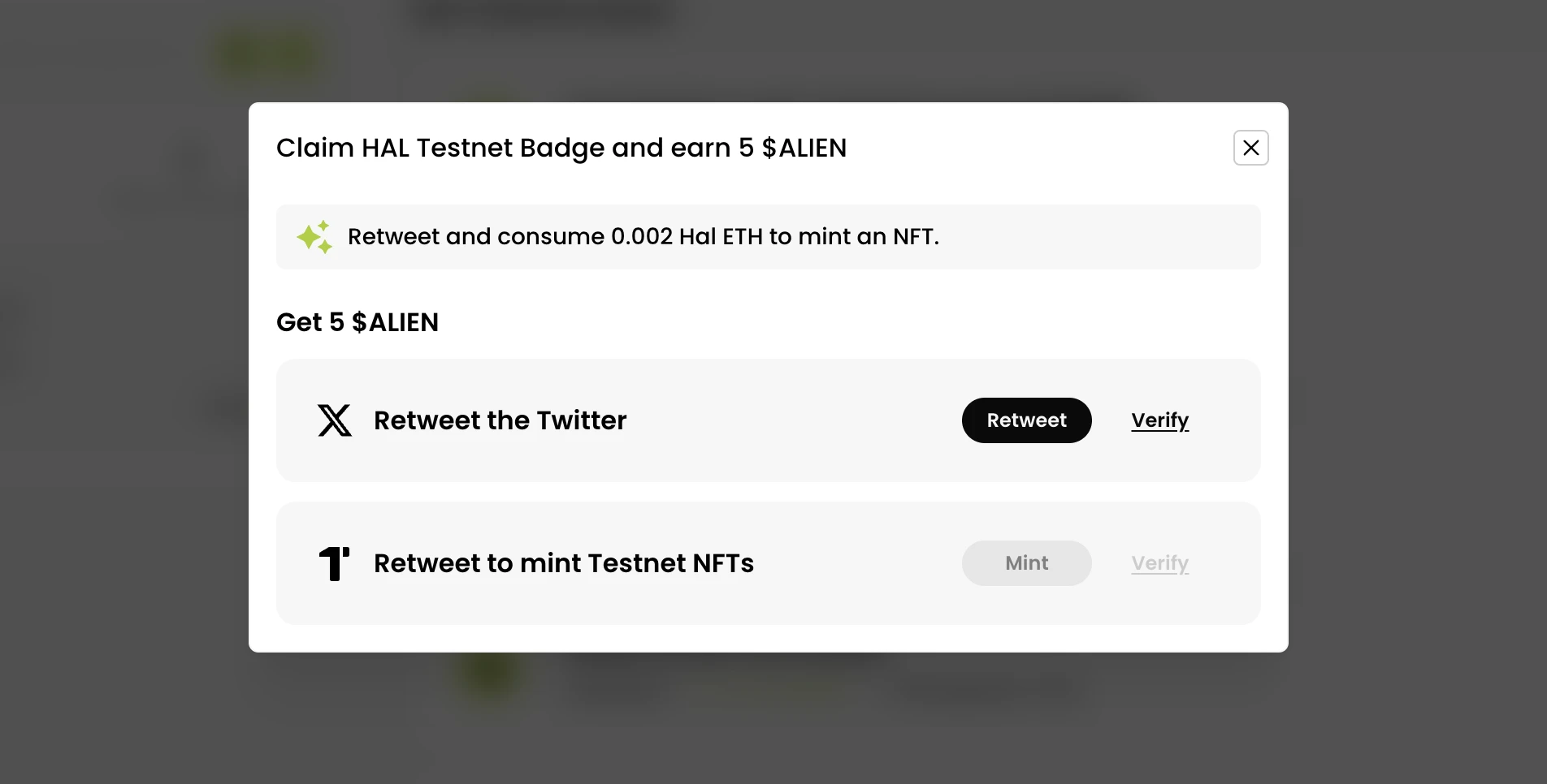 选择 Claim Hal Testnet Badge 并点击 Go Now 铸造外星人徽章 NFT,徽章作为用户参与测试网的重要凭证,这里需要同时转发推特才可以领取 5 $ALIEN。
