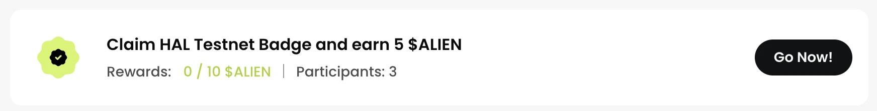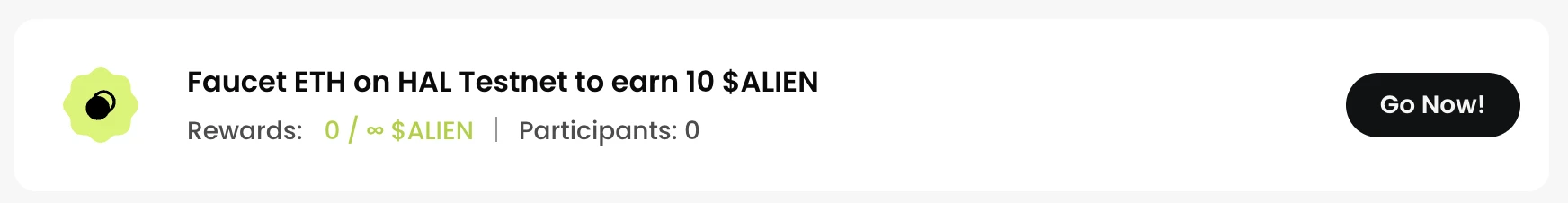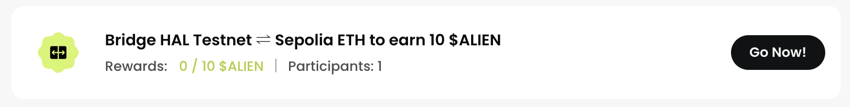 选择 Bridge HAL Testnet 并点击 Go Now 参与跨链桥交互,每完成 1 次跨链,获得 2 个$ALIEN 测试币空投 ,单地址最高 10 个$ALIEN。