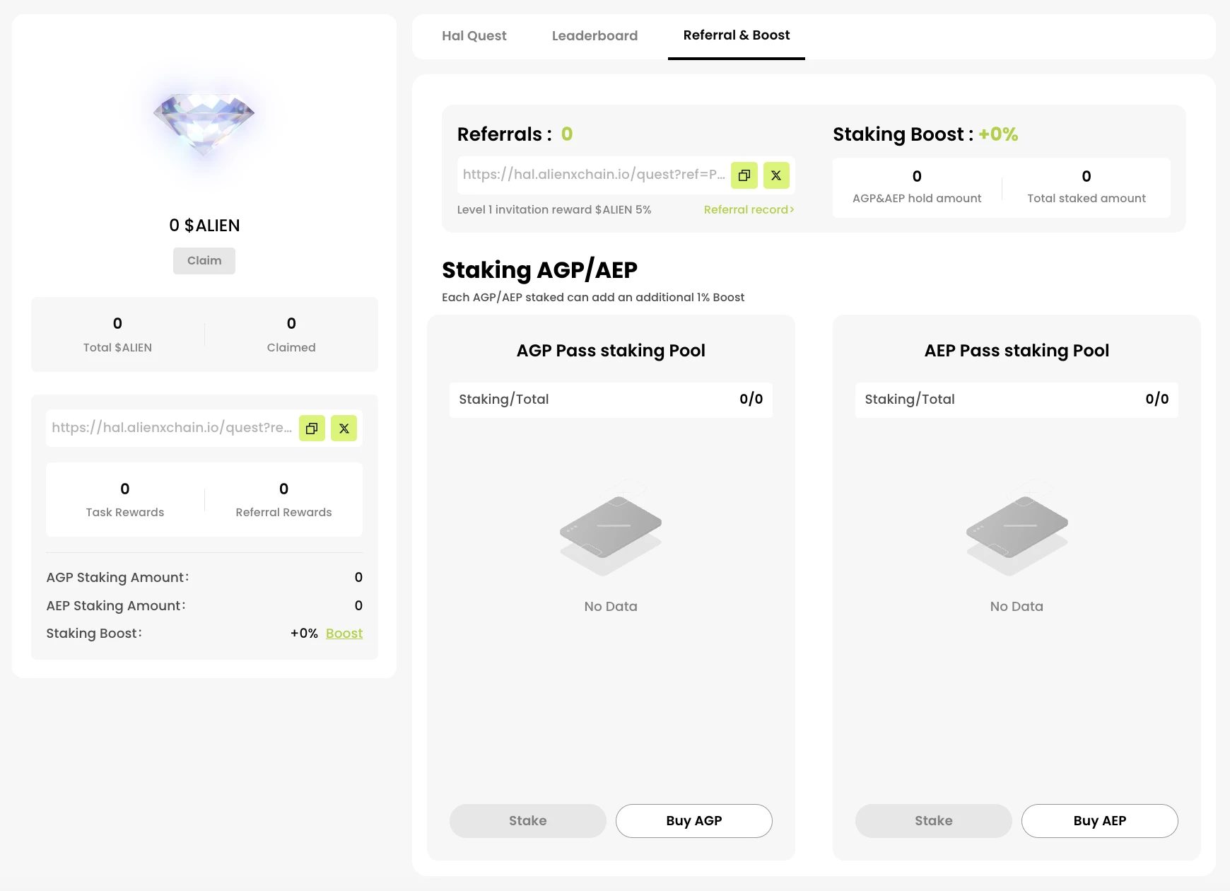 HAL 测试网活动同时支持邀请机制,用户邀请好友参与测试网交互,将获得好友$ALIEN 测试币空投数量的 5% ,且无邀请上限。与此同时,之前参与 ALIENX Staking Season 并质押 AGP 和 AEP 的用户还可以获得 1% 的 Boost 系数。