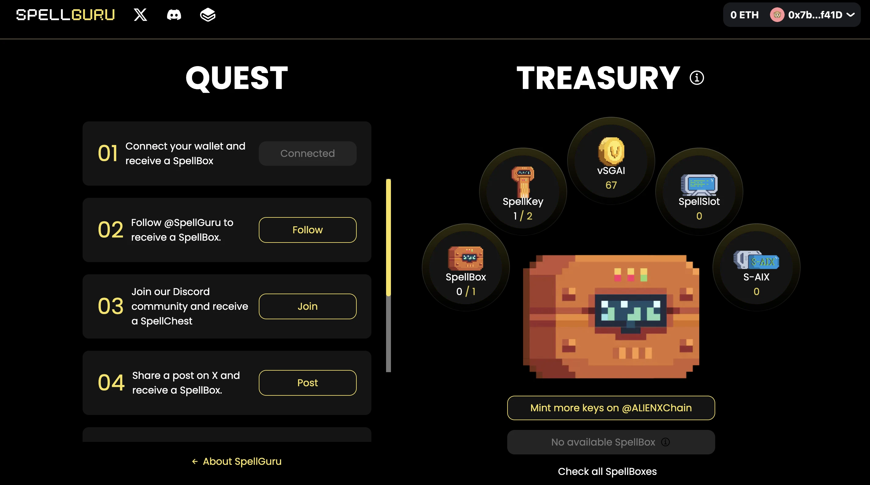SpellGuru 是 HAL 测试网第一个去中心化 AI 模型训练及数据网络,用户可以选择 SpellGuru 点击 Go Now 铸造 Key 并打开 SpellBox 获得 2 个$ALIEN 代币奖励,单地址最高 10 个$ALIEN。当然这里的 Key 也可以通过 AlienSwap 交易获得,另外打开盒子需跳转至 SpellGuru 官网完成社交任务才能打开。