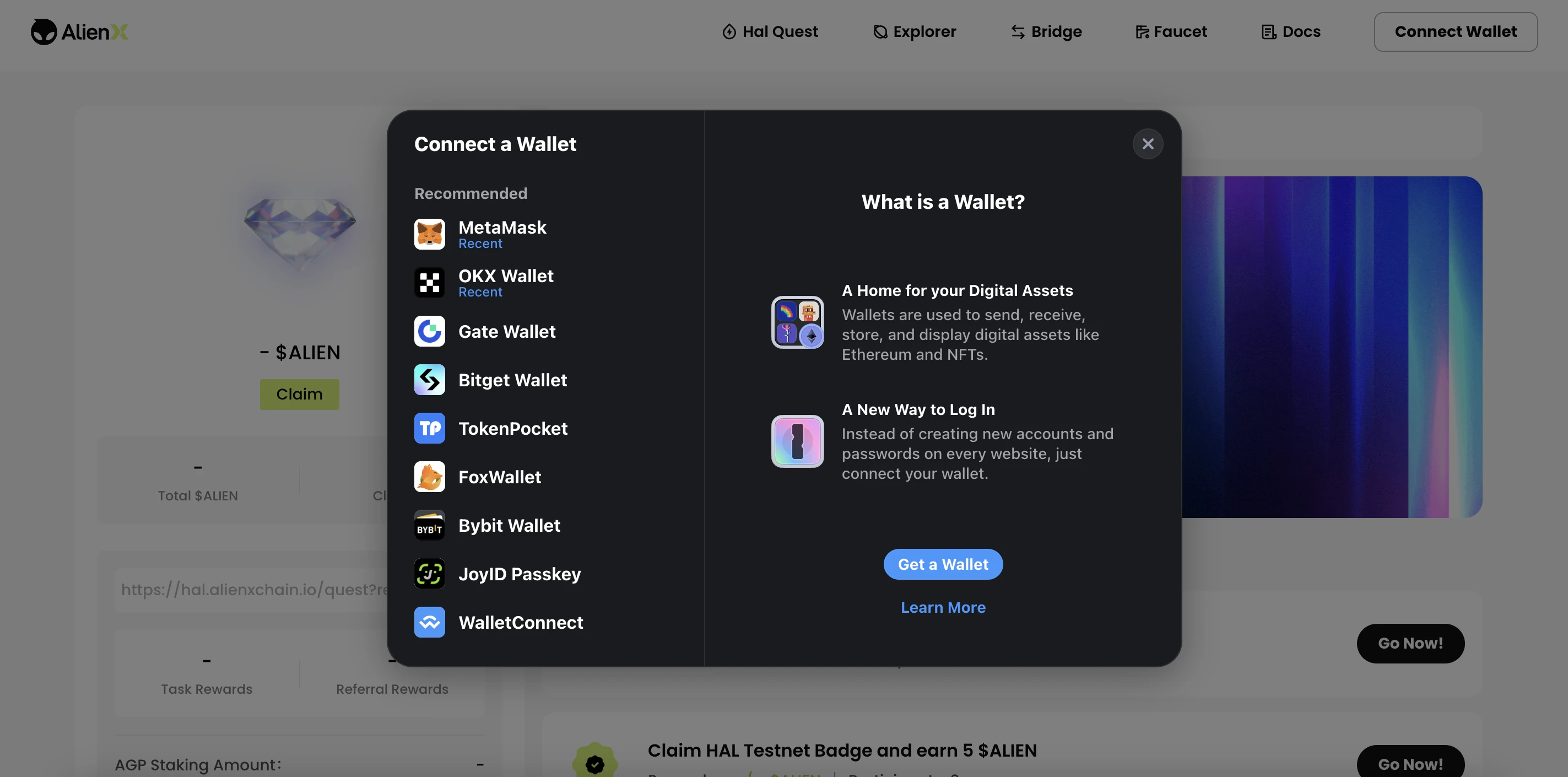 ALIENX 的技术架构基于 Arbitrum Orbit,在测试网交互之前仍有一些准备工作要做。在流程开始之前我们需要准备一个 EVM 钱包,譬如 MetaMask或 OKX Wallet,用 Chrome 安装钱包插件并登录网站连接钱包至 HAL Network 测试网。