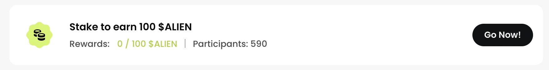 选择 Stake to earn 100 $ALIEN 并点击 Go Now 跳转至 ALIENX 官方 StakingSeason 界面进行资产质押,每完成 1 次不小于 20 $质押,获得 5 个$ALIEN 测试币空投,单地址最高 100 个$ALIEN。