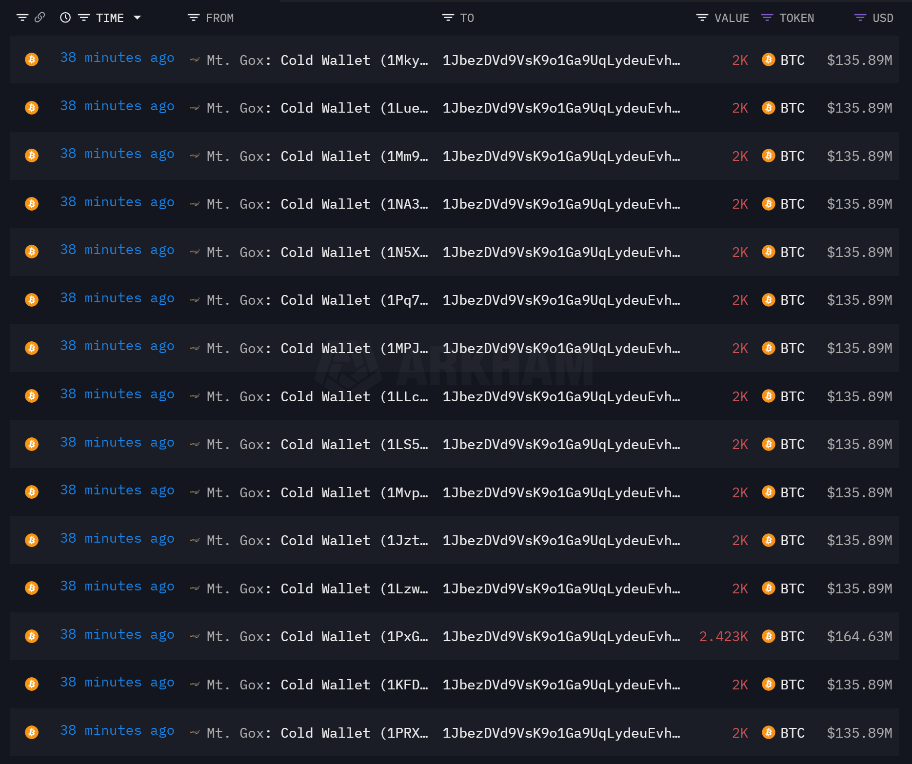 而就在今天稍早,Arkham Intelligence 监测 发现 Mt. Gox 冷钱包自今早 9:41 至 14:07 间,透过多笔交易将所有 14 万 1686 枚 BTC 全数转至不明钱包地址 1JbezDVd9VsK9o1Ga9UqLydeuEvhKLAPs6 中,价值约 96.1 亿美元。
