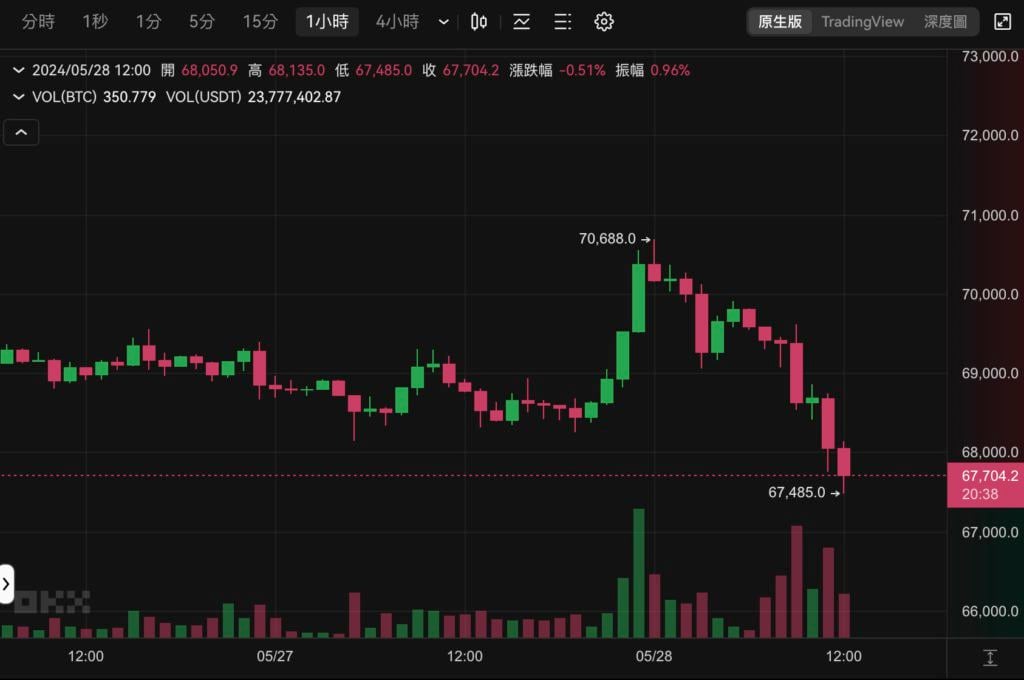 虽然目前转入 1Jbez…钱包的比特币,暂时未发生进一步转移。但是 BTC 刚好在差不多时间发生较剧烈的下跌,截稿前最低报 67,485 美元,12 小时内下跌近超 4%。