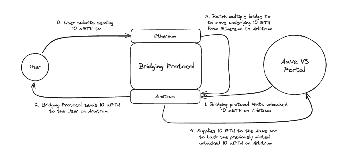 一旦资金在 Arbitrum 上可用,Arbitrum 上被列入白名单的桥接合约将把 10 个 ETH 供应至 Aave 池内,以支撑此前铸造的 10 个 aETH。