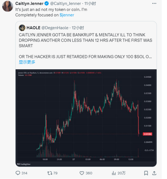 事实好像正应证了这心惊的猜测。在一小时后,代币开发者突然抛售了流动性池中价值 160 个 SOL 的代币,在抛压下Jenner迅速插针腰斩,社区顿感不妙,瞬间谩骂与诅咒齐飞。就当Jenner在归零之路狂奔之时,Caitlyn Jenner再度站台为代币打出了强心一针。