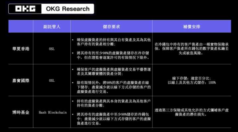 抛开加速传统金融与虚拟资产融合等行业利好,对普通投资者而言,参与虚拟资产现货ETF最切实的优势在于安全性更有保障。这种保障首先体现在更可靠的托管措施和赔付安排上。考虑到虚拟资产特殊性,除主托管人外,香港虚拟资产现货ETF如今均聘任了专业的次托管人负责虚拟资产保管,在提升基金资产管理效率的同时分散托管风险。次托管人不仅要确保现货ETF所对应的虚拟资产与其自有资产及为其他客户持有的资产分离,还需要将大部分虚拟资产储存在冷钱包中,只能将少量暂存在热钱包中以应对认购及赎回需要。