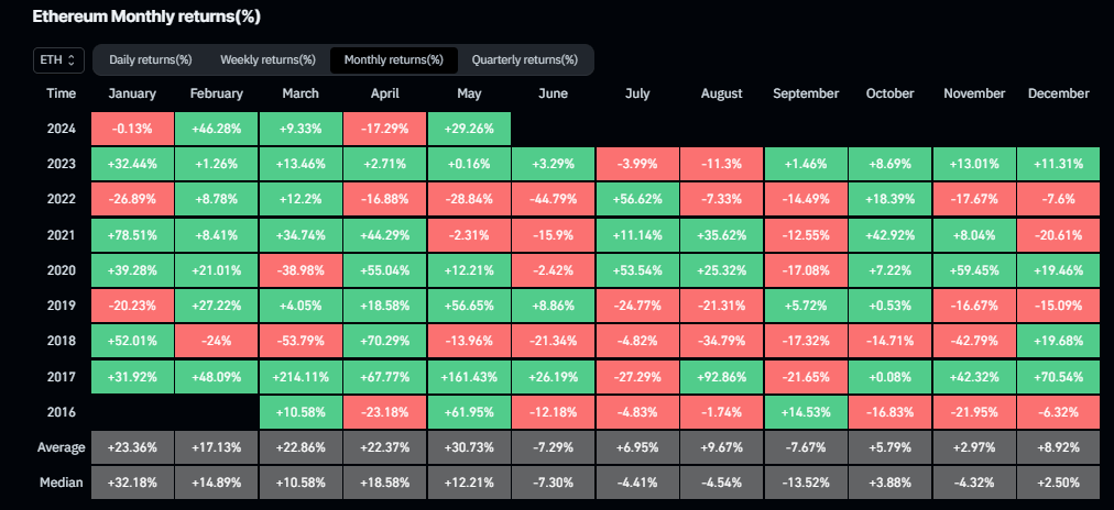 Coinglass历史数据显示,5月通常是以太坊表现最强劲的月份,平均涨幅为31%。
