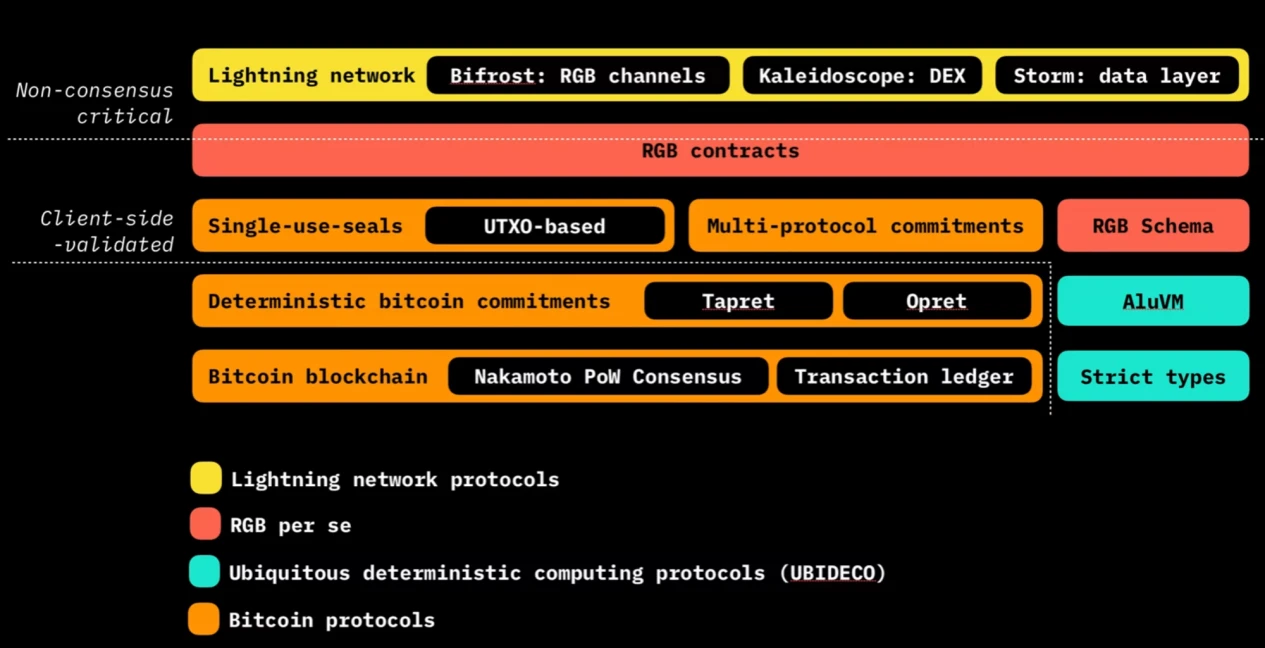 RGB 是在比特币区块链的 PoW 共识层上构建的协议。该协议是有向无环图(DAG)的一个版本,参与者无法看到网络的完整状态,每笔新交易都需要至少两笔先前交易的确认,才能记录在网络上。客户端验证由 RGB 模式提供支持。