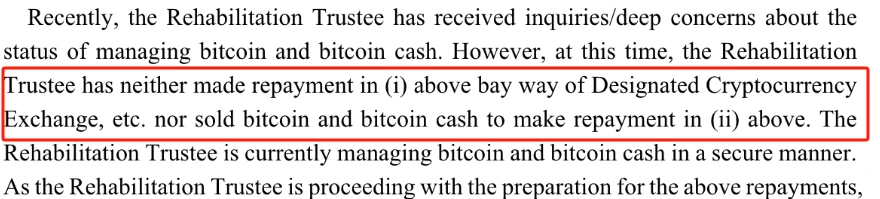 Mt.Gox 发布的文件显示,Mt.Gox 确认此批转账是为了 在 10 月 31 日债权人偿还期限之前做好准备 。据其文件,复原受托人( Rehabilitation Trustee )正在准备就分配加密货币的索赔部分进行偿还准备。索赔有两种方案: 方案一为在指定交易所向债权人偿还 BTC 和 BCH,方案二为出售代币然后再进行偿还。 据 Cointelegraph 报道,截止目前复原受托人 未明确按照什么方案进行赔偿 。