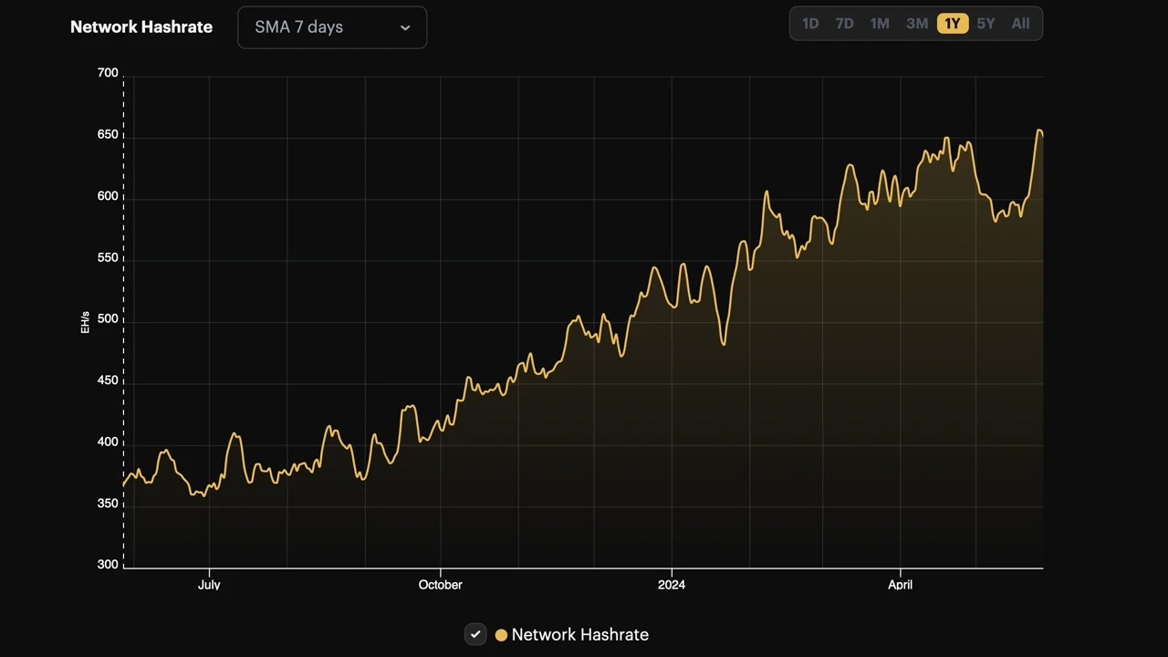 此前 5 月 8 日,7 天简单移动均线(SMA)显示该网络算力已跌至 582 EH/s 的低点。