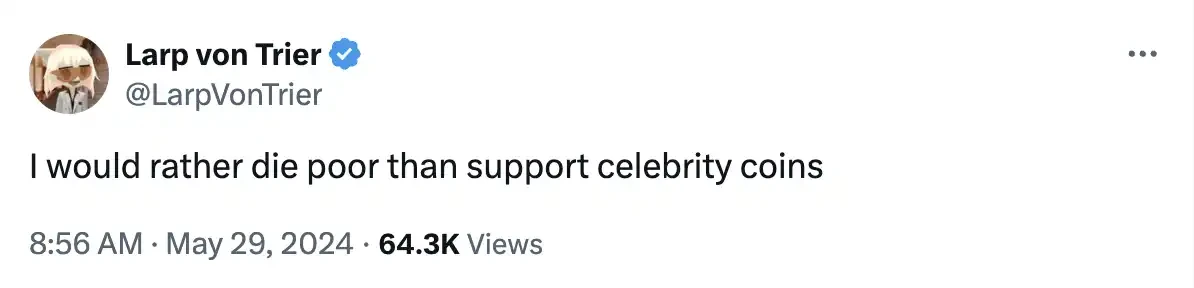 加密 KOL Larp von Trier 甚至直言「我宁愿穷死也不支持名人币。」