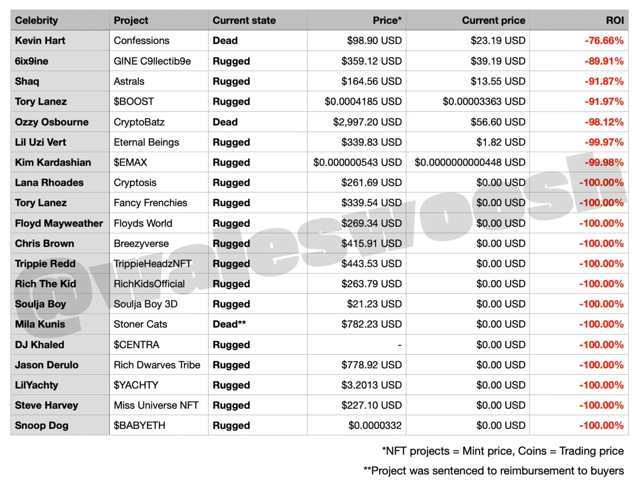 下图是过去一段时间推出的名人币以及名人 NFT 项目其最终命运的统计,可以看出高倍数的涨幅和盈利都是一时的,最终它们的下场都是归零或者 rug。