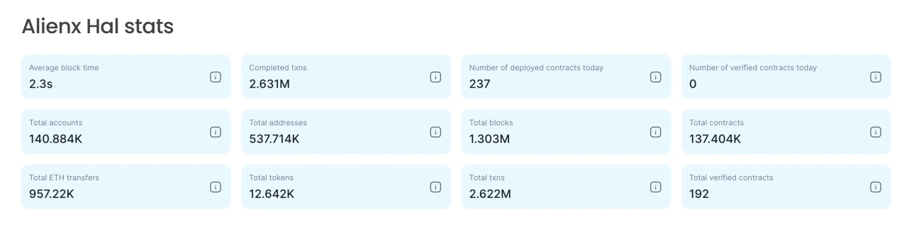 ALIENX Chain 于 2024 年 5 月 24 日正式上线 HAL 测试网活动,测试网活动持续 3 周,上线 5 天就有高达 50 万链上用户参与。