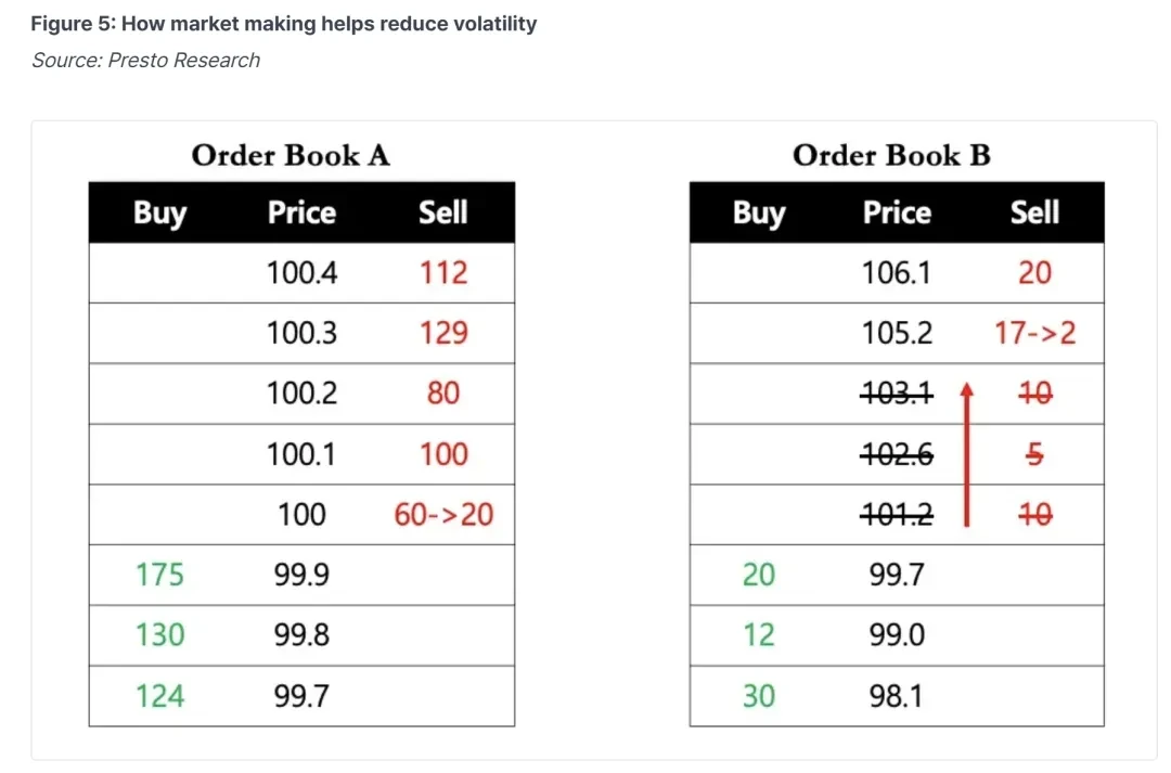 而做市商提供的大量流动性,为订单簿形成较窄的买卖差价(Spread),狭窄的买卖差价通常伴随着坚实的市场深度,有助于稳定币价,缓解价格波动。