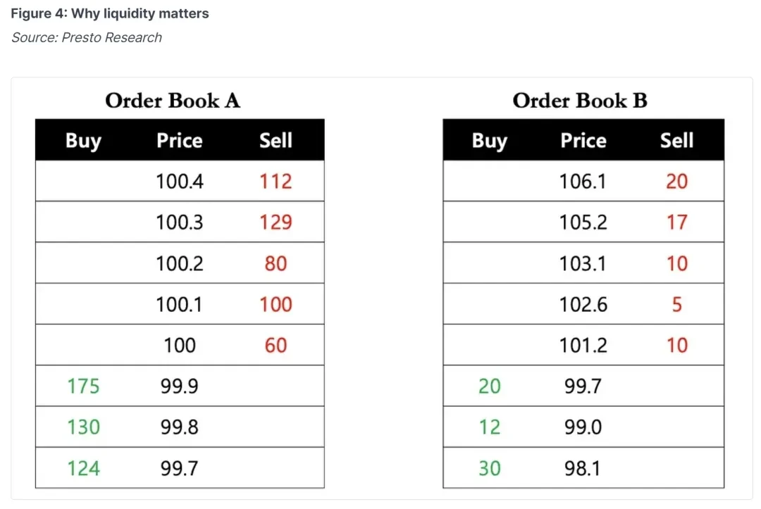 在上述场景中,投资者刚购买了 40 个代币后,订单簿 B 中的下一个可用价格是 105.2 美元,这表明一次交易造成了大约 5% 的价格波动。这在市场波动期间尤其如此,较少的参与者可能导致价格显著波动。