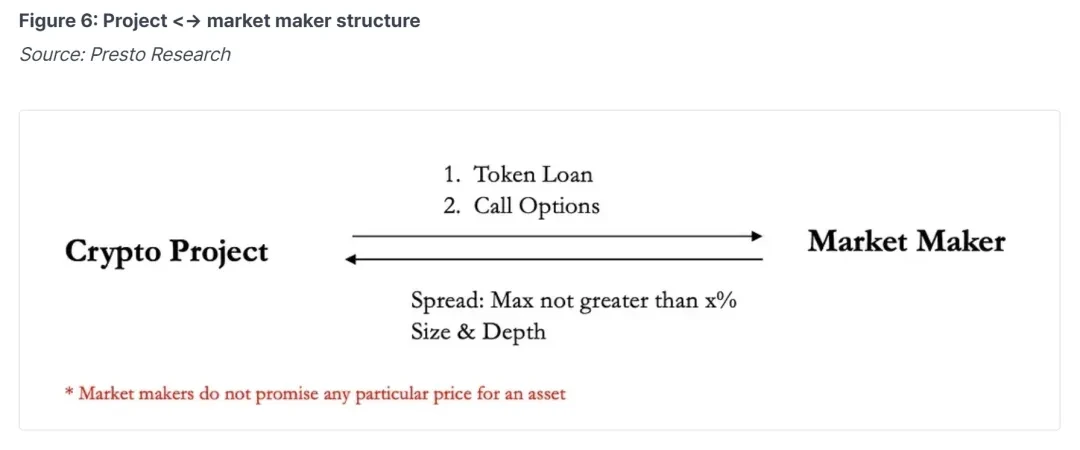 这种模式下,做市商会从项目方手上借入代币(Token Loan),以投入市场以确保流动性及稳定币价,一般约定 1 — 2 年做市期限。