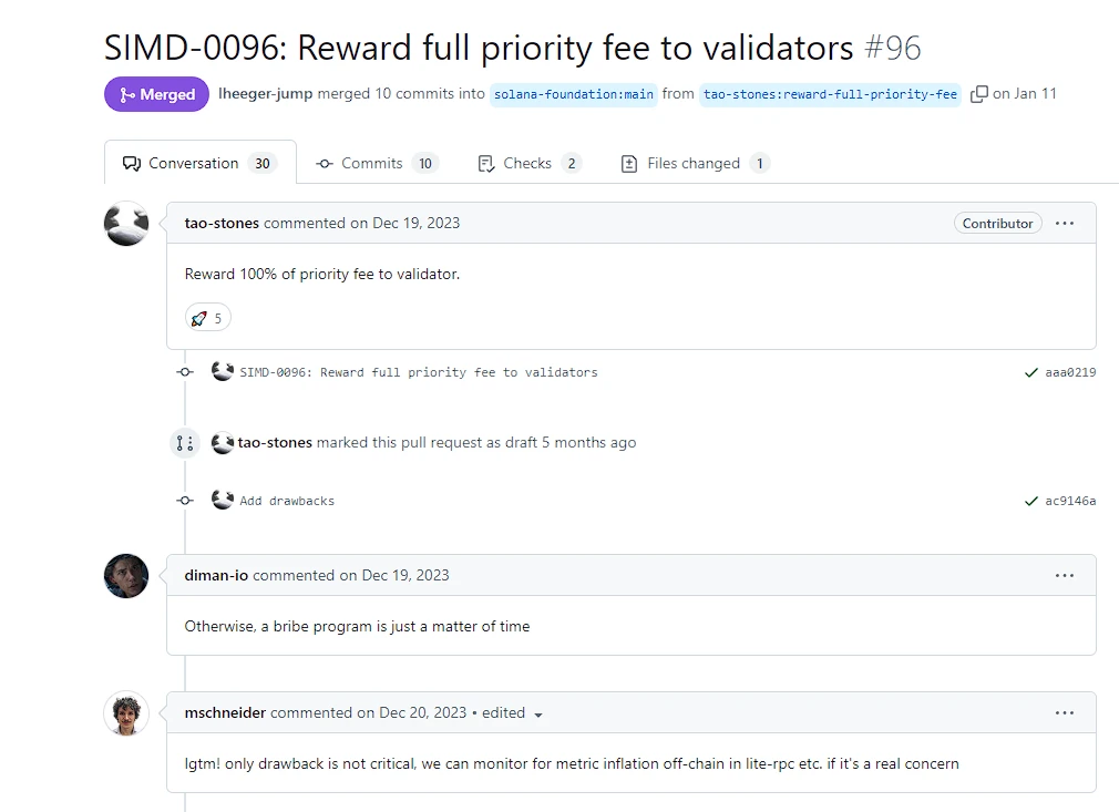 事实上,根据 Github 上的信息显示,该方案早在 2023 年 12 月就被提出。最初提出的时候主要是几个核心开发者在 Github 上通过留言的方式进行简单讨论。从最初的讨论来看,提出该方案的 Tao Zhu 并未提及改变这个比例的原因。参与讨论的几个开发者对这个方案几乎一致表示同意,做了相关测试并在新版本中改变了这个功能,将 100% 的优先费用分配给验证者。