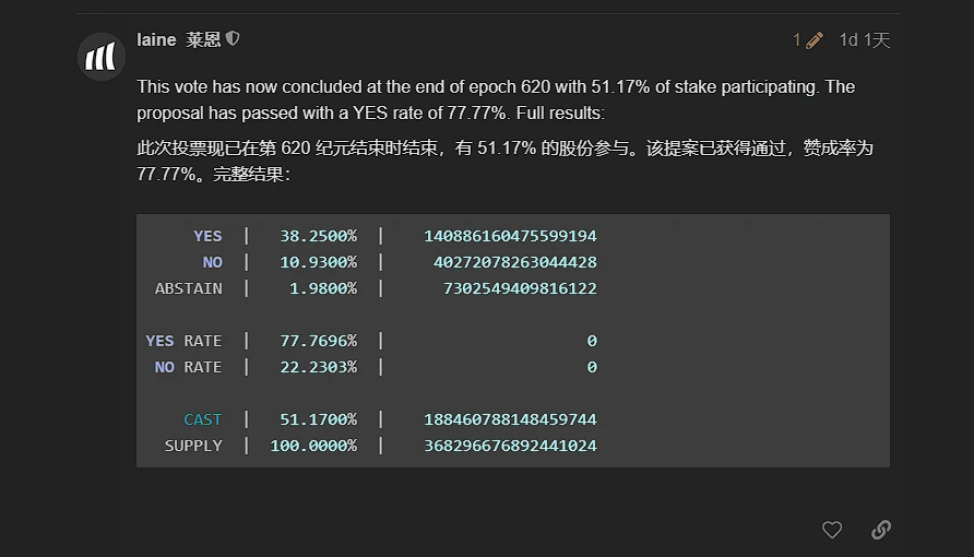 最终,该提案在诸多争议当中还是顺利通过,不过 PANews 也注意的参与本轮投票的选票占比为 51.17% ,刚刚过半。而事实上只有总选票的 38.25% 投了赞成, 10.93% 的选票投了反对。约有 49% 的选票未参与这次投票。就目前来看,将 100% 的优先费用奖励给验证者这个提案本身的影响具体会有多大还未可知,但从社区争论的过程来看,Solana 的治理流程确实存在诸多问题。