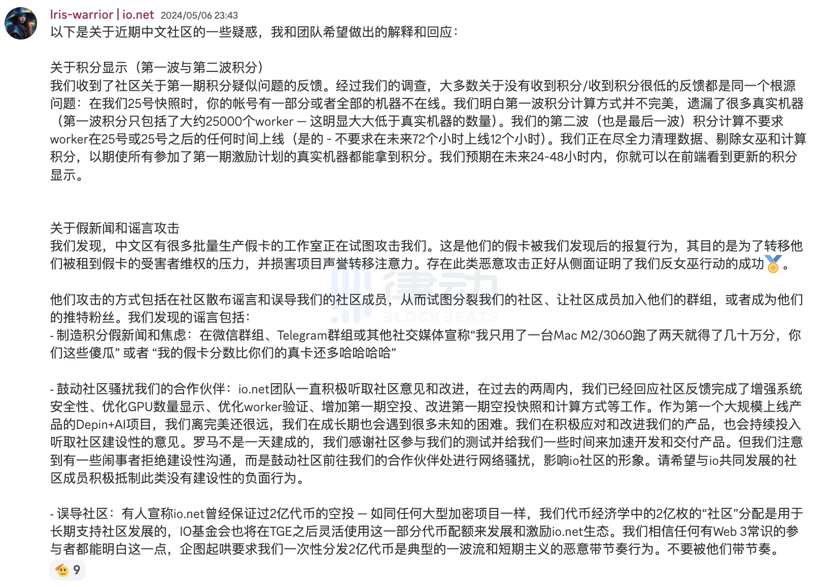 面对「全网讨伐」,io.net 团队在 discord 里发出了一篇长文回应。表示将进行第二期积分计算,剔除女巫、保留真实用户。除了积分争议,团队还表示社区正在遭遇「假新闻和谣言攻击」,并指出是背后是假卡工作室的推动。