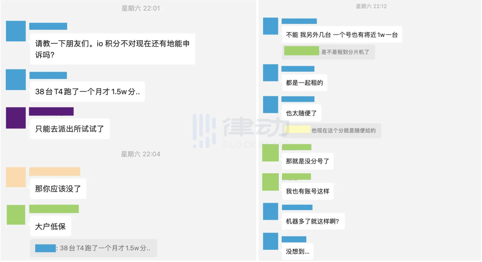 第一期积分公布后,许多用户因为快照时期机器没有在线获得了很低的积分,社区里开始出现一些指向 io.net 项目方的维权行动。朱睿回忆道, 5 月 3 日,推特上有人发起了一场名为「io.net 批斗大会」的 space,在没有预热的情况下有 1000 多名用户参加,微信群里到处都是维权信息。