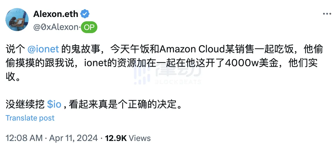 目前,没有渠道计算云服务商在这波 io.net 带起来的天降财运中的具体盈利数字,Alex 曾在一条推文中表示,国外龙头云服务商亚马逊云,在提供挖 io.net 的服务上共产生了 4000 万美元的收入。尽管评论区对这个数字的质疑声更多,但如果按照当时 io.net 前端显示的几十万台 GPU 数量来算,这个数字也许不算夸张。
