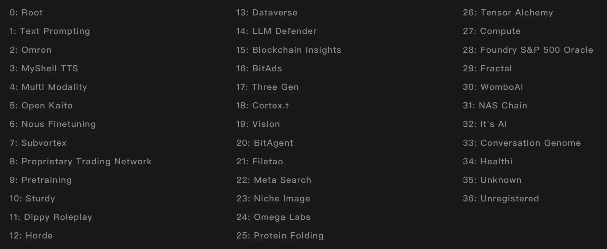 文本提示(子网 1): 由 Opentensor 基金会开发,是专门用于文本生成的去中心化子网。它利用大型语言模型(如 GPT-3、GPT-4 等)进行提示和推理,矿工提供 AI 服务,验证者负责验证预测结果。
