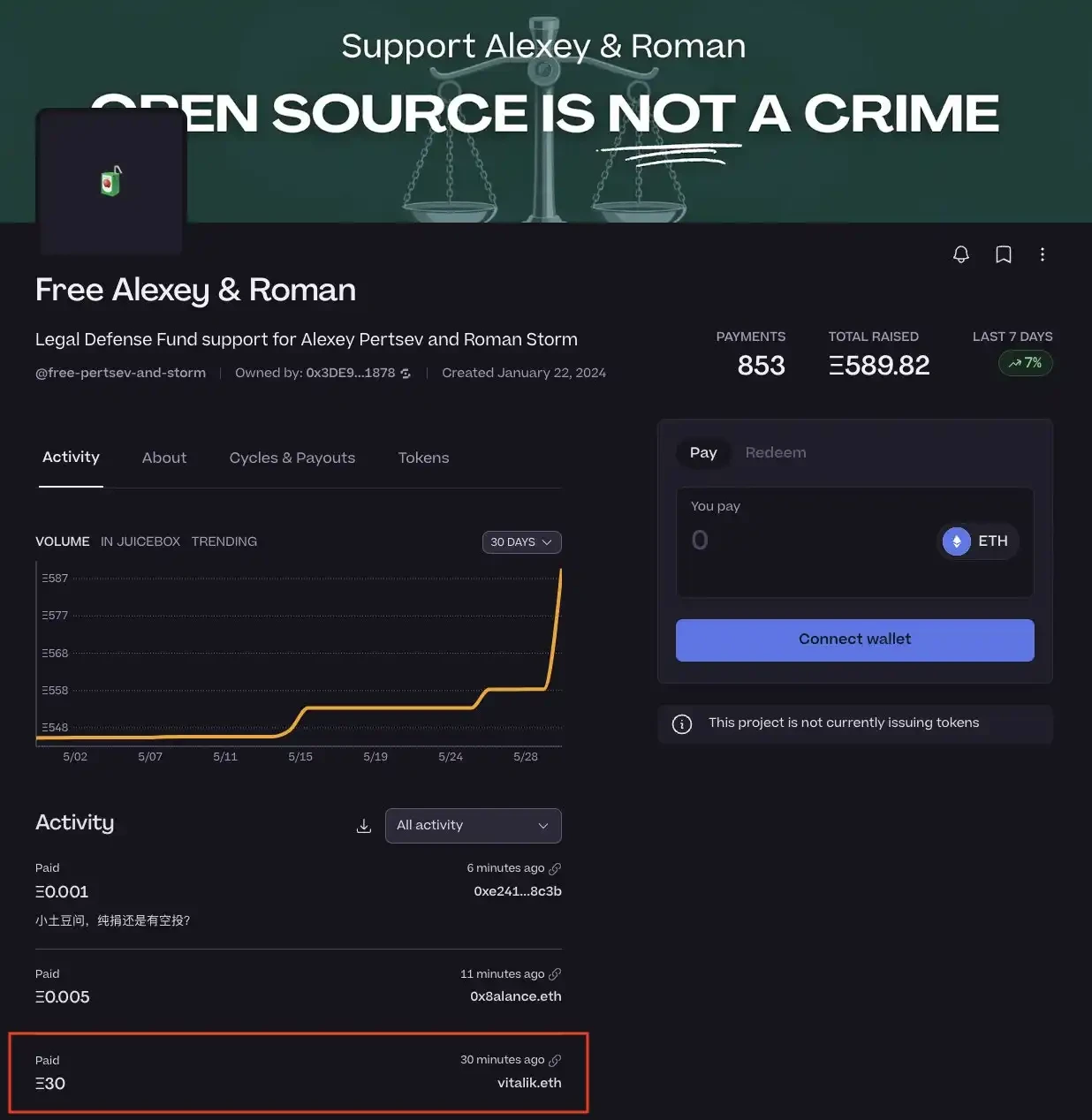 Roman Storm 的审判定于 9 月进行,而「Free Alexey & Roman」筹集的资金将用于支持二人的法律辩护基金,目前该项目已筹集 589 枚 ETH。