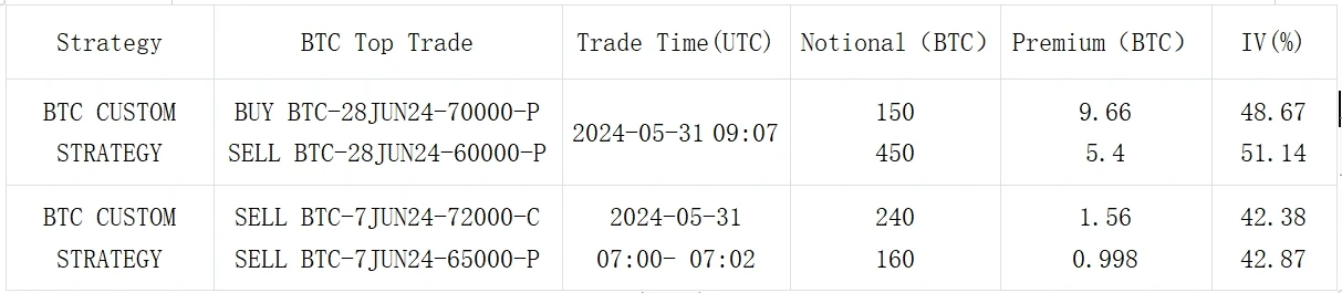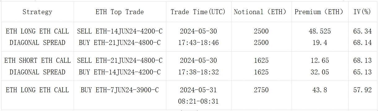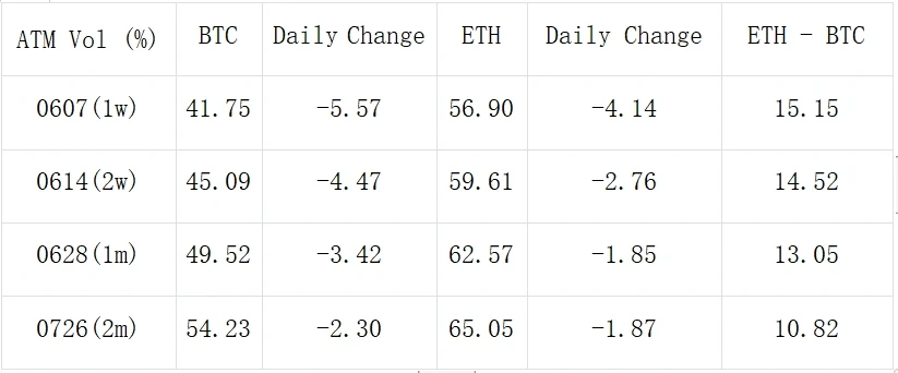 期权方面,隐含波动率明显走陡下调,BTC 前端再度下降 4-5% 左右, 1 month 之内的 ATM IV 均回到了 50% 以下。ETH 的 IV 整体也在下跌,但各期限上仍高出 BTC 10% +Vol,ETF S-1 批准日期仍然未知,市场普遍认为最早也要在 7 月份通过,过去 24 小时 ETH 的成交反应出较为明显的倾向,表现在 7 月中下旬大量看涨期权建仓以及月底以 3000-P 为代表的看跌卖出。