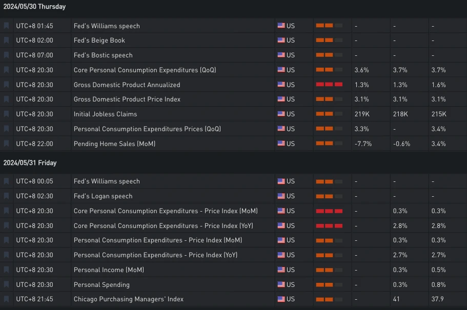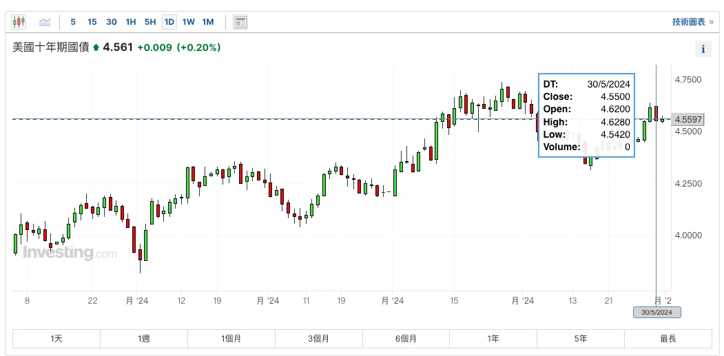 昨日(30 MAY)美国经济数据的降温重新提振了市场对降息的信心,实际 GPD 年化下修至 1.3% (前值为 1.6% ),为 2023 年第一季度以来新低,通胀数据和消费者支出两者轻微下降,成屋销售指数则是超预期大幅下降录的-7.7% ,为 2021 年 2 月以来新低。数据公布过后美债回吐前日全部涨幅,当前两年期/十年期分别为 4.948% /4.561% 。