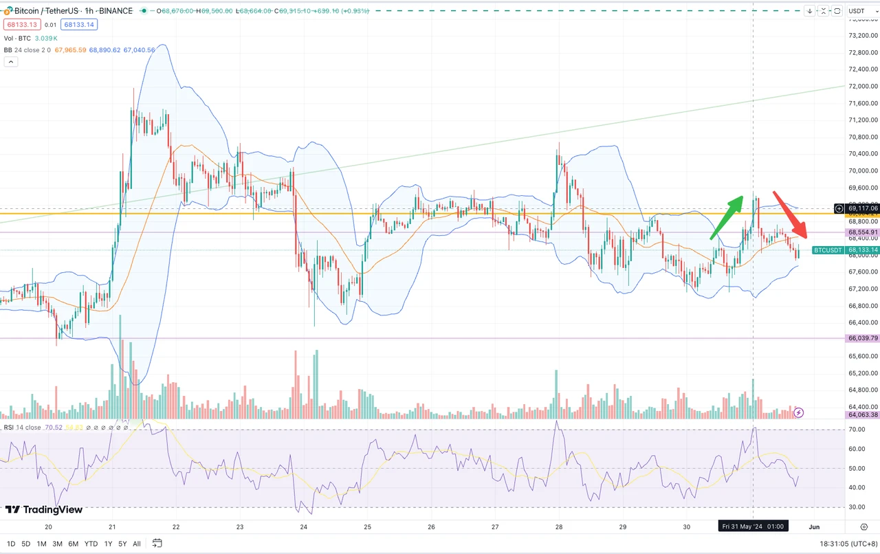 数字货币方面,作为本月收官之日,BTC 和 ETH 分别收报 68201.52 (+ 0.62% )/ 3731.97 (0.12% )。回顾昨日行情,美国经济数据公布提振了币价上行,推动 BTC 短暂地突破 69000 美元,但价格在峰值很快迎来回调短线落回 68000 上方附近,从近期走势来看, 69000 似乎已从支撑位转变成了一道关键的阻力位。