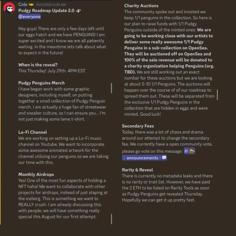 在 Luca Netz 和新团队接手之前,Cole 的团队已经发布了多个路线图项目,包括:周边商品、空投和慈善拍卖等。