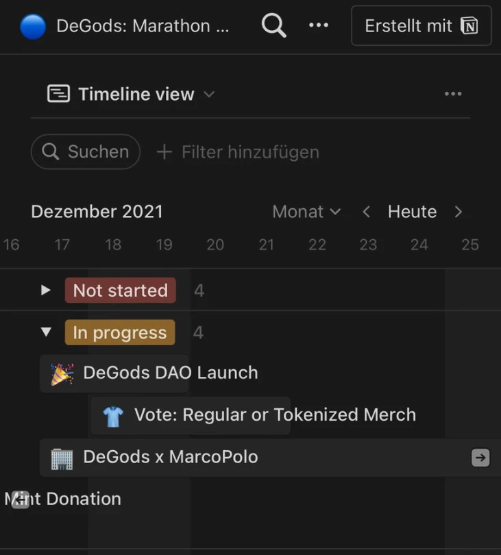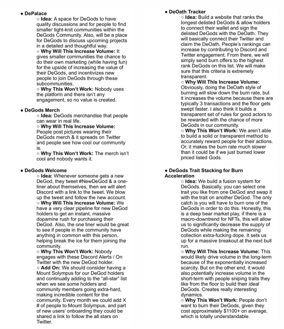 我发现了一个很久前的谷歌文档,其中 Frank (?)讨论了某些路线图想法的优缺点。其中包括:DePalace、Merch(商品)、DeGods Welcome、DeOath。
