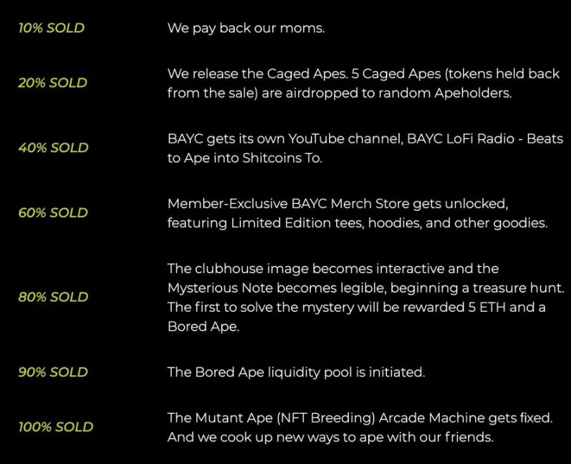 它们推出了第一批周边商品,虽然并不是持有者独享的,但至少完成了。这些周边商品包括马克杯、连帽衫、T 恤和贴纸。而空投和慈善拍卖在当时是有限的,不能视作完成。