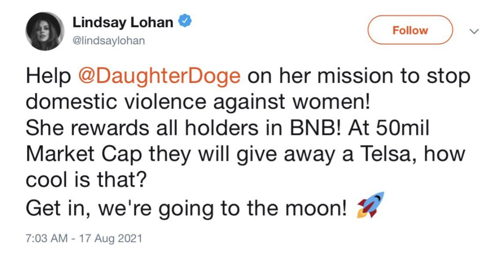 早在 2021 年,她就推销过几个代币,包括 DaughterDoge 和 MetaNetflix。两者全都被 Rug 了。