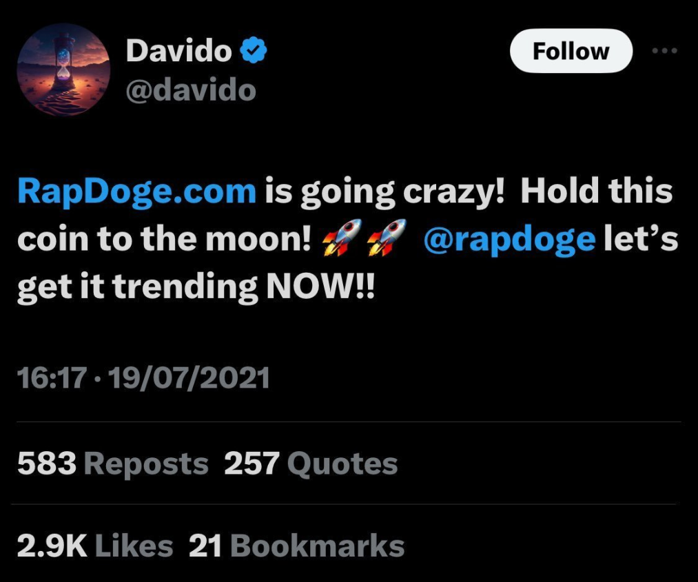 他在 2021 年喊单 RapDoge 并向他的粉丝们抛售 30 万美元。