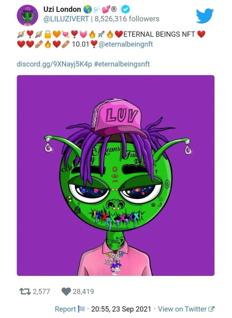 2021 年的 Solana 夏季,Lil Uzi Vert 决定成为 Eternal Beings 系列的代言人。