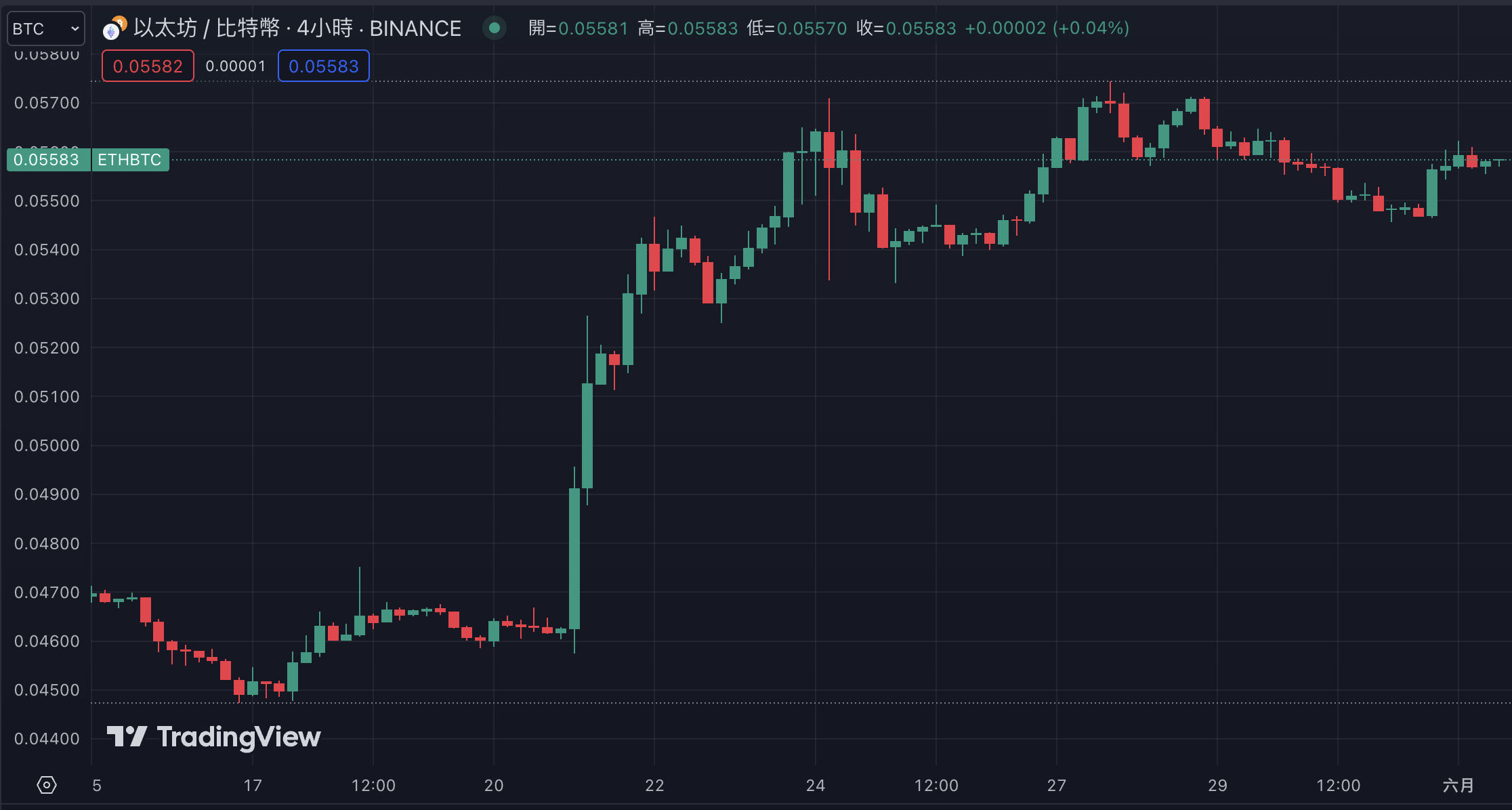 ETH/BTC 比率从 5 月 17 日𫔭始上涨,并于 5 月 27 日达到两个月高点 0.05744,涨幅超过 28%,现报 0.05584。Nancy Lubale 从技术角度说道,ETH/BTC 周缐图显示出与相对强弱指数的看涨背离,这表明「趋势逆转已经𫔭始」。