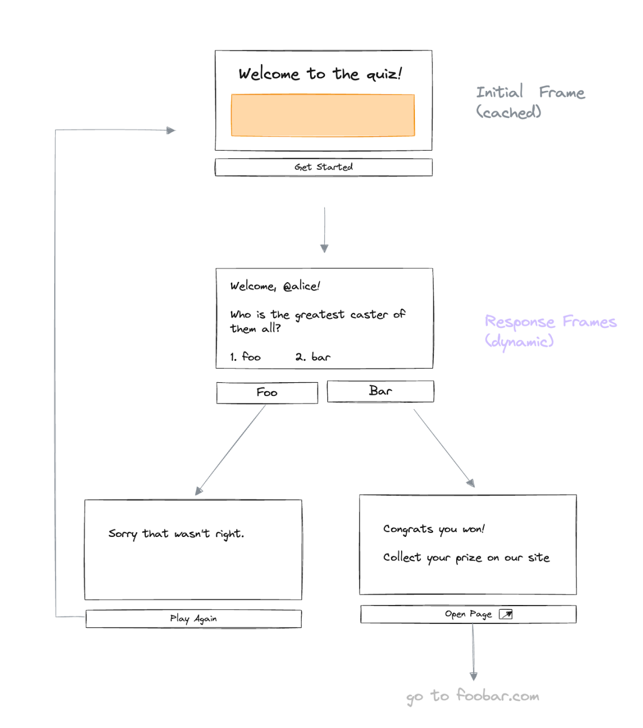 Frame 让自定义体验注入 Farcaster 信息流成为可能。它扩展了 Open Graph 标准,并通过添加多达 4 个按钮将静态图像转为交互式体验。当用户按下按钮时,根据按钮点击和发送到 Frame 生成服务器的用户元数据,他们会得到一个新图像。
