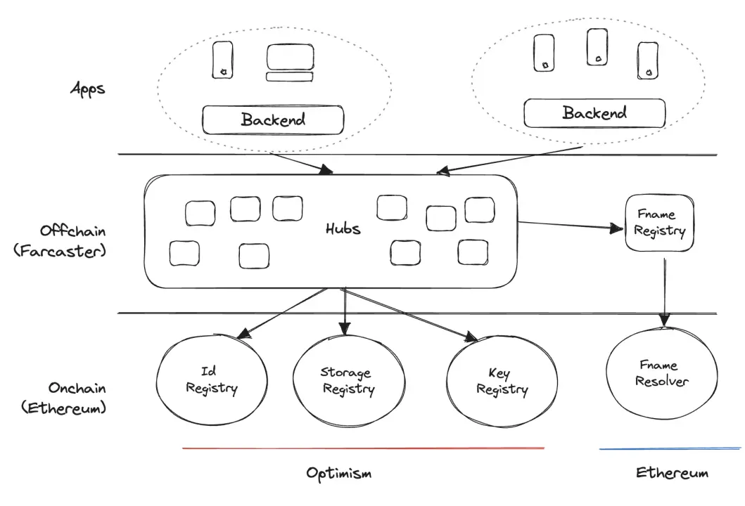 Farcaster 通过部署在 Optimism 上的一组核心智能合约来实现其架构: