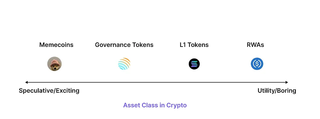 这张图展示了加密资产两端的不同性质:一端是以 MEMECOIN 为代表的娱乐至死、疯狂投机,一端是以 RWA 资产为代表的乏味实用性资产。