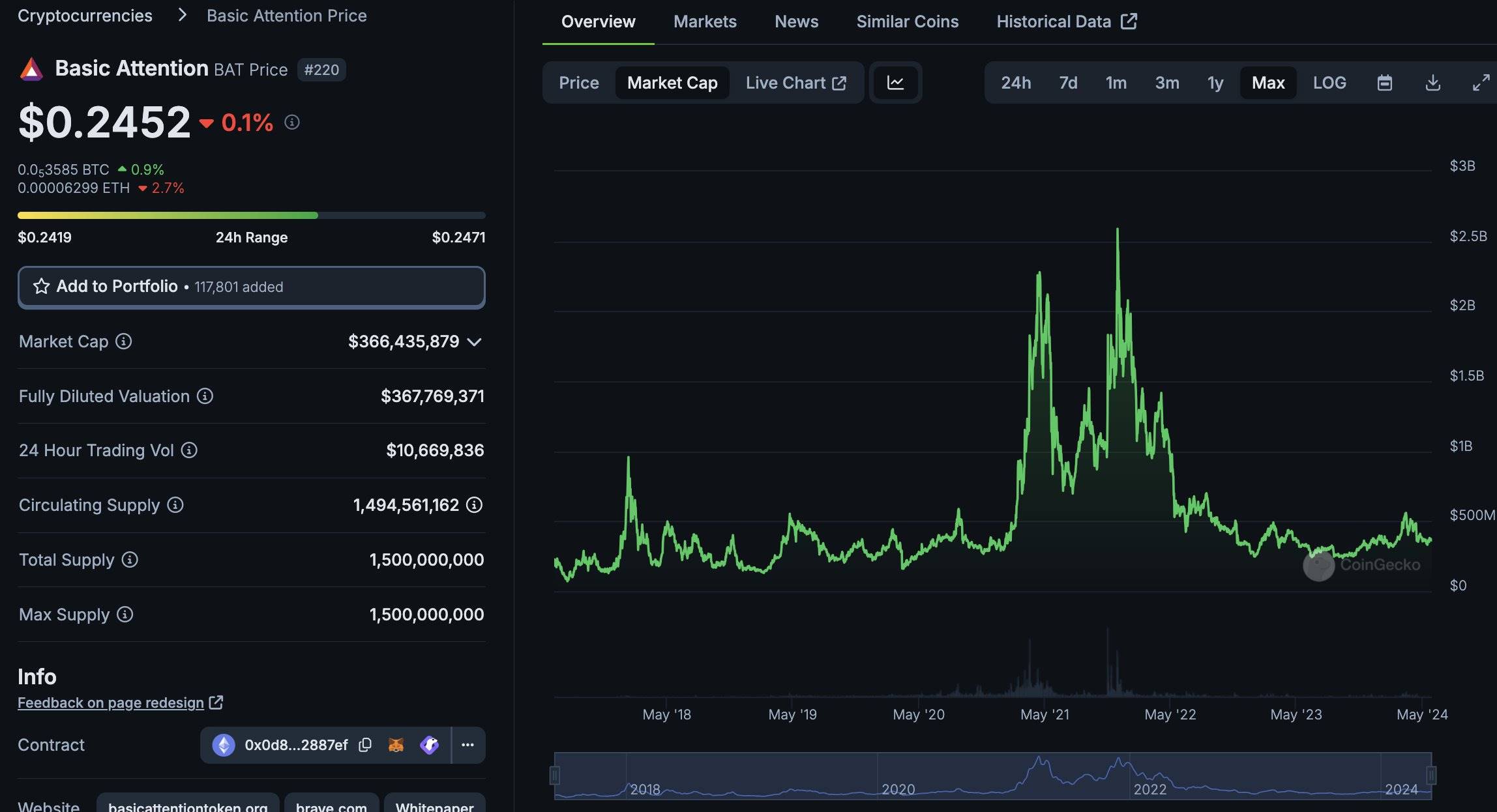 但 $BAT 的价格却没有显著增长,时至今日 $BAT 的价格却与 2017 年首次发行时相近, 同时期的 $ETH 早已从 250 美元涨到了 3900 美元。