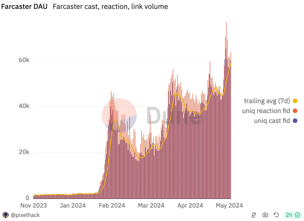 Farcaster 在 2 月用户大幅增加,当时$DEGEN 社区代币空投给早期用户。令人惊讶的是,日活用户继续增长,达到 59, 000 。