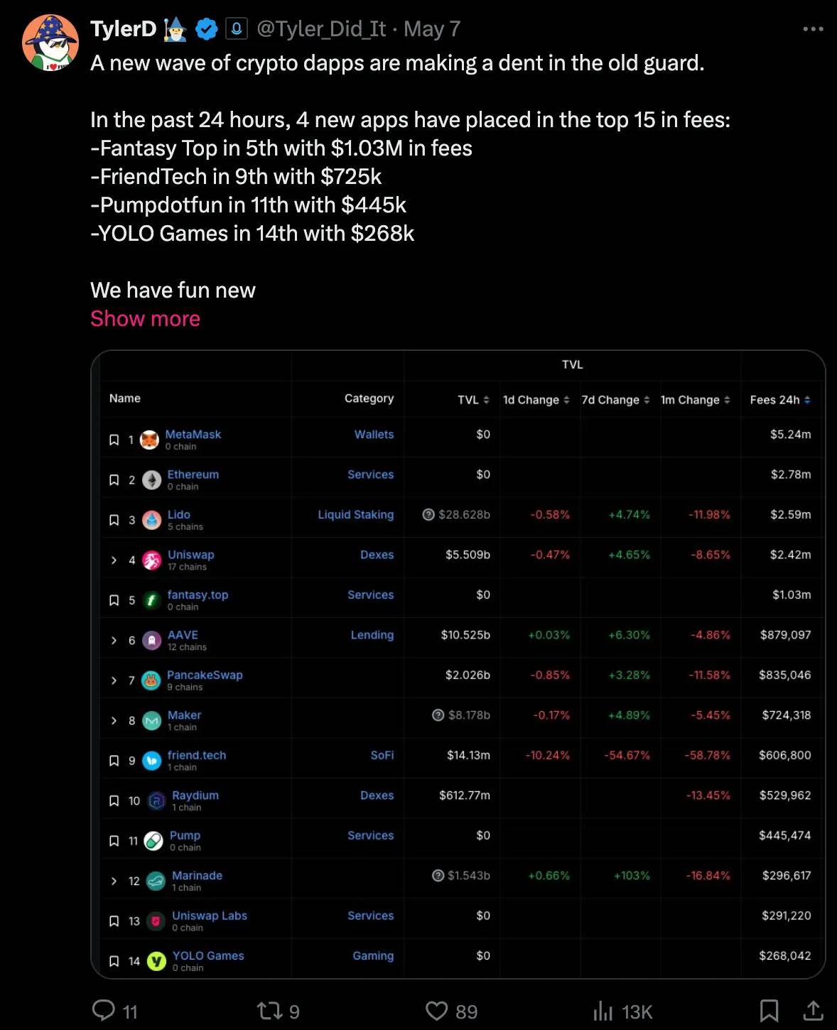 5 月 7 日,四个新的社交应用短暂进入了按费用生成的前 15 个协议。