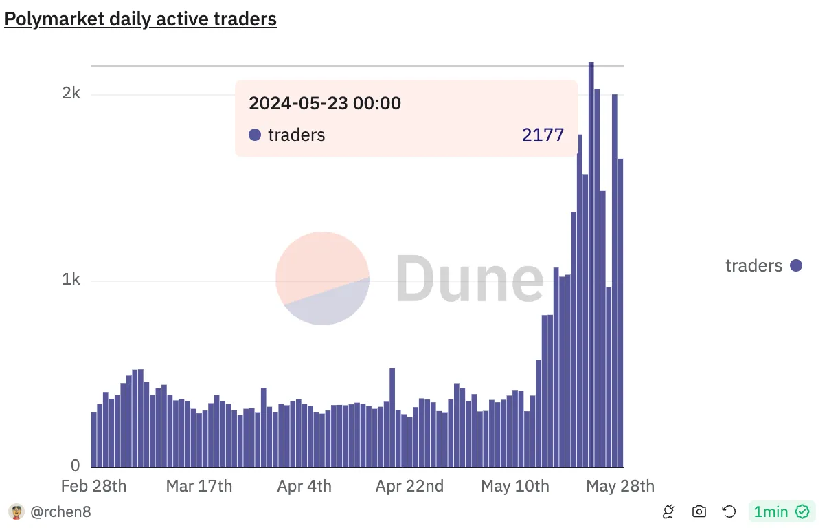 在 ETH ETF 批准的投机狂潮期间,Polymarket 有大约 2000 名日活用户。仍然太少,但增长潜力很大。
