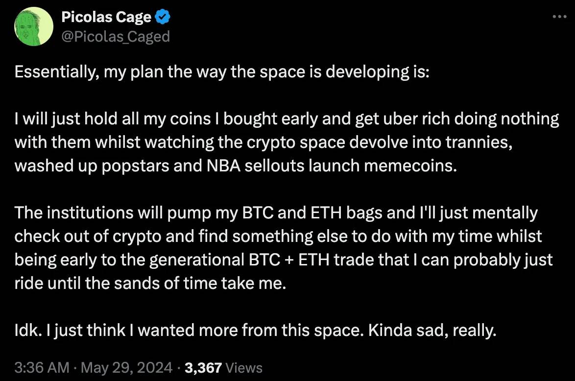 在我上一篇博客中,我提到了市场无聊的状态,分享了可能推动市场上涨的外部催化剂。ETH ETF 和美国政府对加密货币态度的改变可以起到作用,但更多的外部催化剂如降息将在稍后推动牛市。