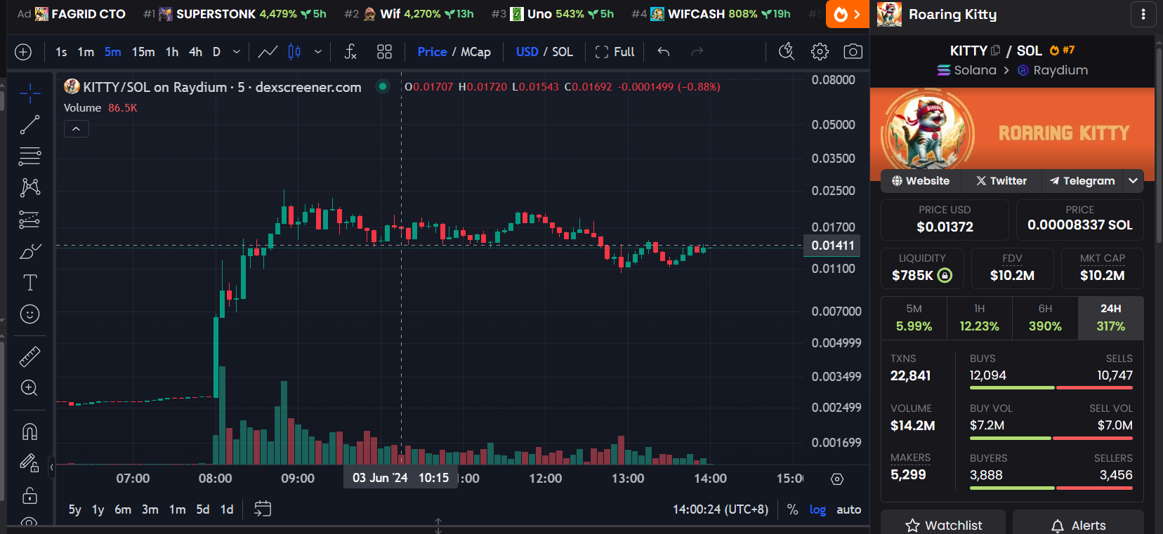 $Kitty 是 Roaring Kitty 的同名代币,在 5 月 Roaring Kitty 时隔三年首次发推后旋即暴涨,今天也随着 Roaring Kitty 的新动态拉升将近 1000% 后回落。