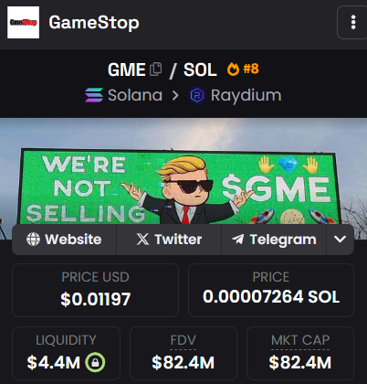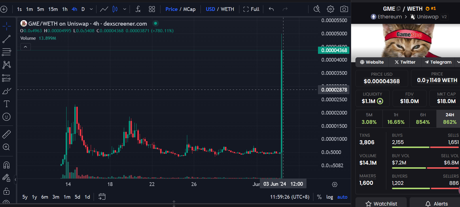 不管这条推文到底有何暗示 or 明示,由于 Roaring Kitty 个人形象已经和 Wall Street Bets Themed 这一概念深度绑定,此条推文一出,游戏驿站股票$GME 的 Solana 链同名代币$GME 短时上涨接近 300% ,而在 ETH 链的$GME 更是飙升近 800% 。