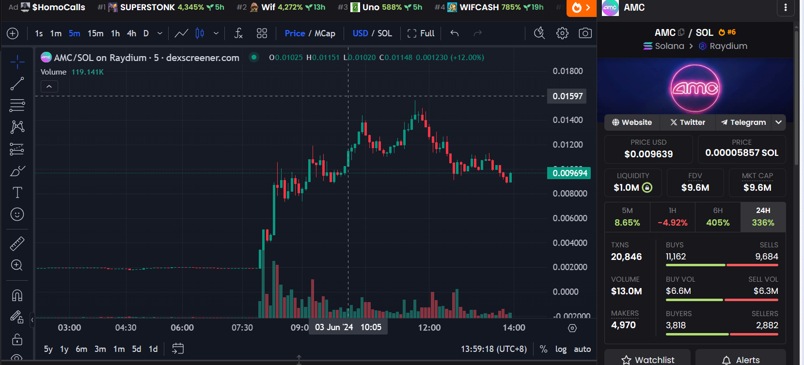 和$GME 的叙事类似,$AMC 也是美股$AMC 的同名代币,作为北美最大影院的$AMC 也是北美散户热衷炒作的标的,从价格表现看$AMC 也明显受到 Roaring Kitty 的推文影响,拉升接近 700% 后回落。